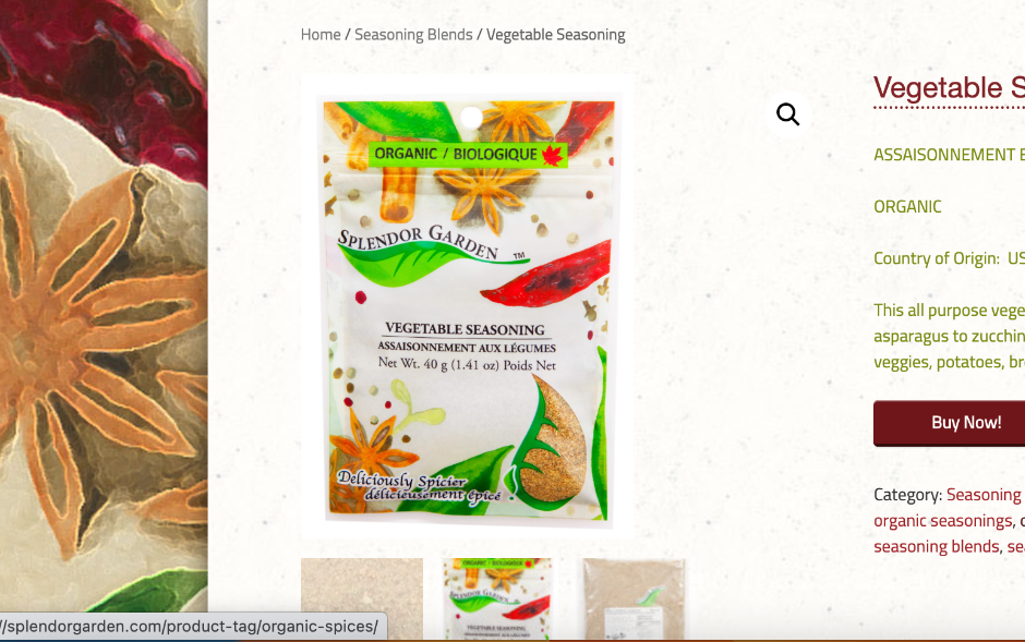 ORGANIC Country of Origin: USA This all purpose vegetable seasoning enhances every vegetable from asparagus to zucchini.