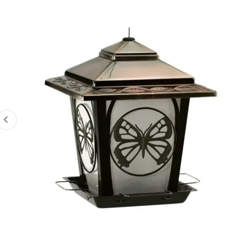 Durable powder coated steel construction. 4 removable perches for large birds. Ready to hang with vinyl coated stainless steel cable. Easy to fill lift-off