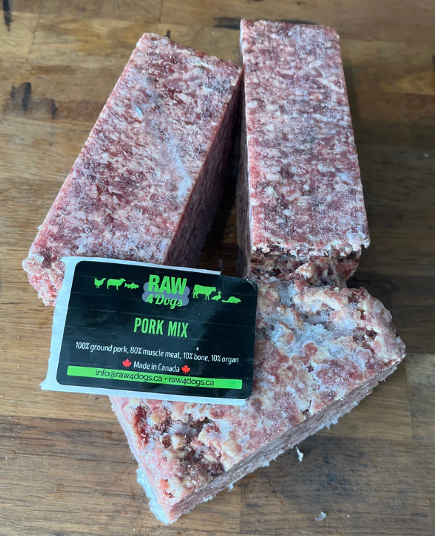 Our Pork Mix delivers a nutritionally balanced raw meal with 70% muscle meat, 10% organ meat, and 20% raw bone—the ideal ratio for a complete, whole-prey d